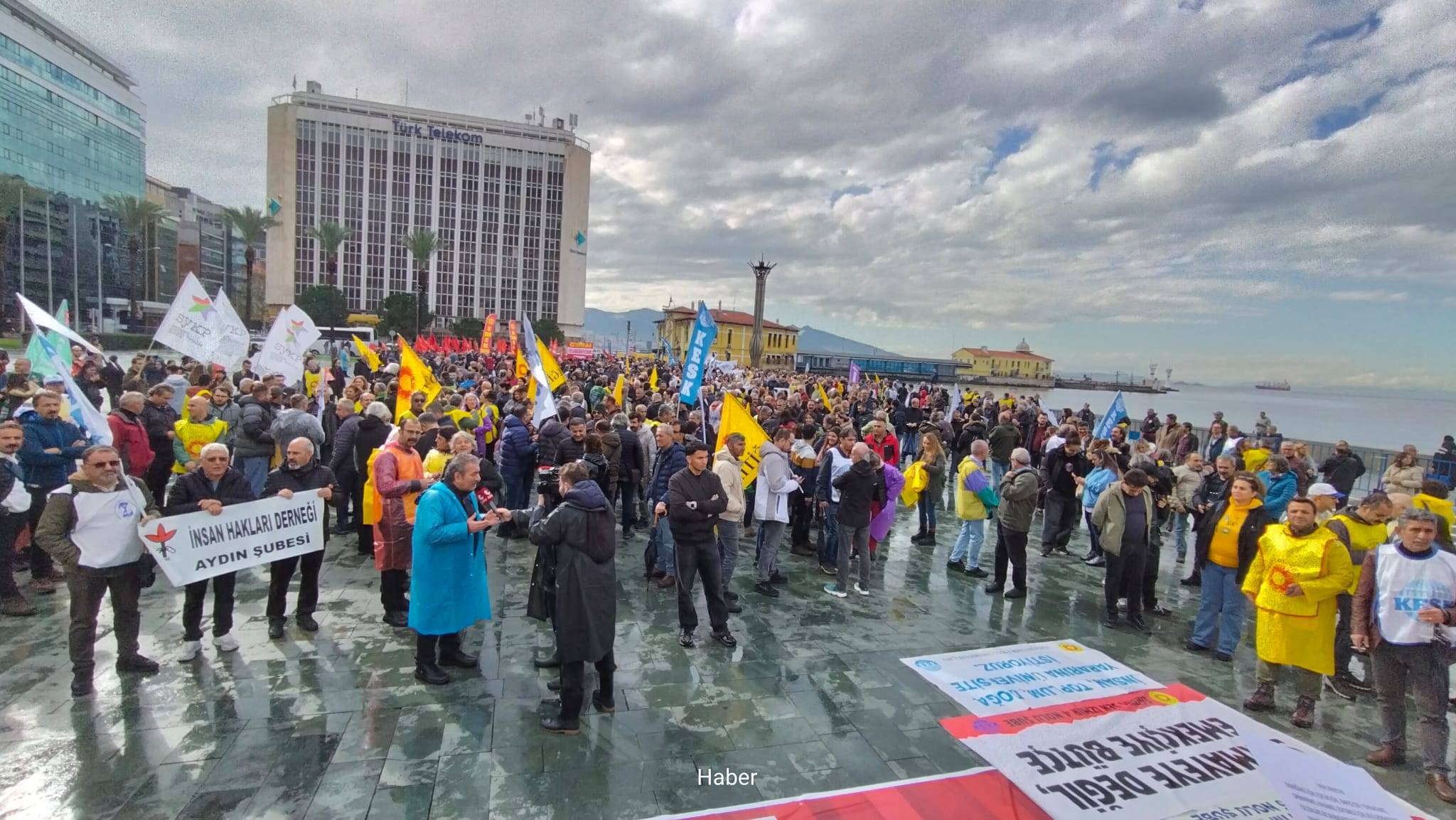 İzmir’de yağmura rağmen gerçekleşen mitinge ise 10 bine yakın kamu çalışanı katıldı. Cumhuriyet Meydanı’nda toplanan kalabalığa seslenen KESK İzmir Şubeler Platformu Dönem Sözcüsü Başak Edge Gürkan, şunları söyledi, “Değerli işçiler, emekçiler, kamu emekçileri, emekliler, gençler, kadınlar emeğiyle geçinip bütçeden hakkını talep etmek için yollara düşenler hoş geldiniz. Manisa’dan, Balıkesir’den, Uşak’tan, Denizli’den, Muğla’dan ve tüm Ege Bölgesinden gelen tüm emekçiler, GEÇİNEMİYORUZ diye bugün meydanlara inen tüm İzmir halkı hoş geldiniz. Ve bugün bu mitingi örgütleyen bileşenleri alın teriyle bu bütçenin yüzde 90’nını üretip yüzde 10 bile pay alamayan işçi, emekçilerin temsilcileri KESK, TÜRK-İŞ, İzmir Tabip Odası, İzmir Barosu üyeleri ve hakları için direnen Temel Conta işçileri, Digel Tekstil işçileri hoş geldiniz”