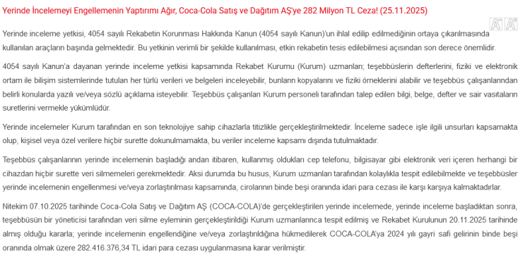 Rekabet Kurumu, 7 Ekim 2025’te Coca-Cola Satış ve Dağıtım AŞ’de gerçekleştirilen yerinde incelemede kritik bir tespit yaptı. İnceleme başladıktan sonra şirket yöneticilerinden birinin veri silme eyleminde bulunduğu Kurum uzmanlarınca belirlendi. Bu bulgunun ardından Rekabet Kurulu, 20 Kasım 2025 tarihli kararıyla Coca-Cola’nın yerinde incelemeyi engellediğine ve/veya zorlaştırdığına hükmetti.
