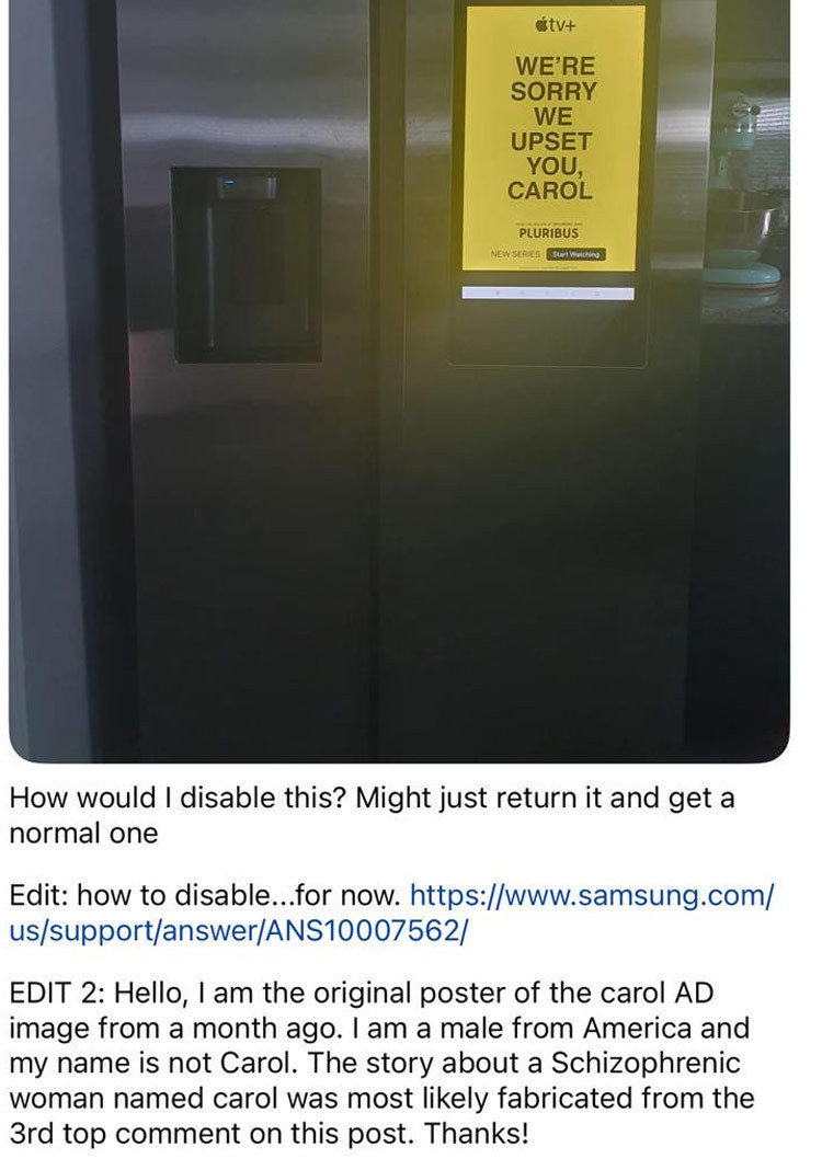 Görüntü, çıkış kaynağı olan Reddit’te binlerce yorum aldı. Bu yayılım öyle geniş oldu ki kısa sürede dolaşıma giren bir anlatıya göre, şizofreni hastası bir ‘Carol’ bu reklamı kendisiyle iletişim kuran bir mesaj olarak algılamış, psikoz geçirerek hastaneye kaldırılmıştı.