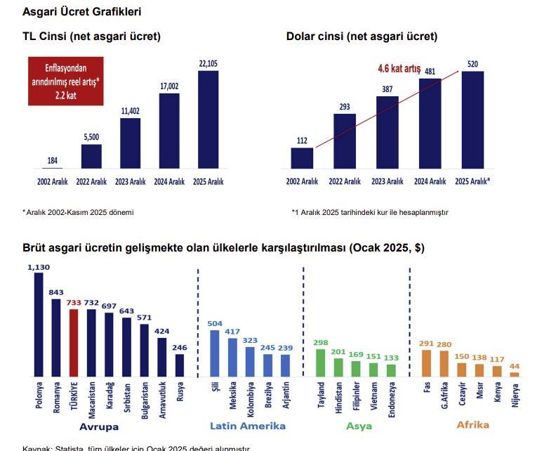 “2025 yılında asgari ücrete, yılın tamamını kapsayacak şekilde beklenen enflasyon hedefiyle uyumlu şekilde artış yapılmıştır. 2026 yılı için de muhtemelen yılın tamamını kapsayacak şekilde beklenen enflasyon düzeyi ile paralel olacak şekilde artış yapılma ihtimali yüksektir. 2026 yılı için Merkez Bankasının enflasyon beklentisinin yüzde 16 olduğu görülmektedir. Bu beklenti doğrultusunda eğer asgari ücret artışı yapılırsa yüzde 16’nın üzerinde artış olması gerekecektir. Asgari ücretin belirlenmesinin ardından ücret artışlarının dezenflasyon sürecine zarar vermemesi adına mutlak suretle fahiş fiyat artışları ile ilgili önlemler artırılmalıdır. Yapılacak bu ilave artışların piyasada yeni fiyat artışlarıyla karşılanmaması için piyasa koşulları çerçevesinde mutlaka gerekli önlemlerin alınması elzem gözükmektedir.”